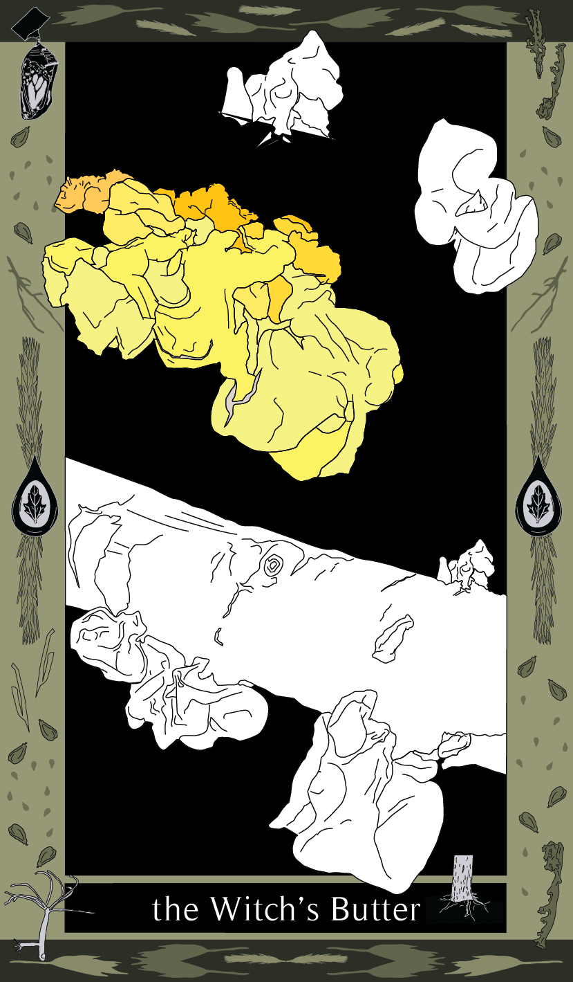 Description: The unraveling had begun; the doorframes and objects were all being disassembled; a branch was falling back into a state of fragments and particles. Some things had been packed into boxes. It was not a sad nor a happy time, necessarily, when the "yellow brain" knocked. It was raining. The antennae of our intuitions were transmitting terabytes of knowledge. The Witch's Butter found the threads of these streams and attached itself, in the channel they held open, a place between this manifestation and the next. Existing in the space between. It enjoyed the sugars that were being pulled from this opening by others, resources loosened from the hold of their envelopes. Soothed and lulled by this atmosphere; growing in the aftermath of something; suspended; producing, with a tremble, some mystical solutions.