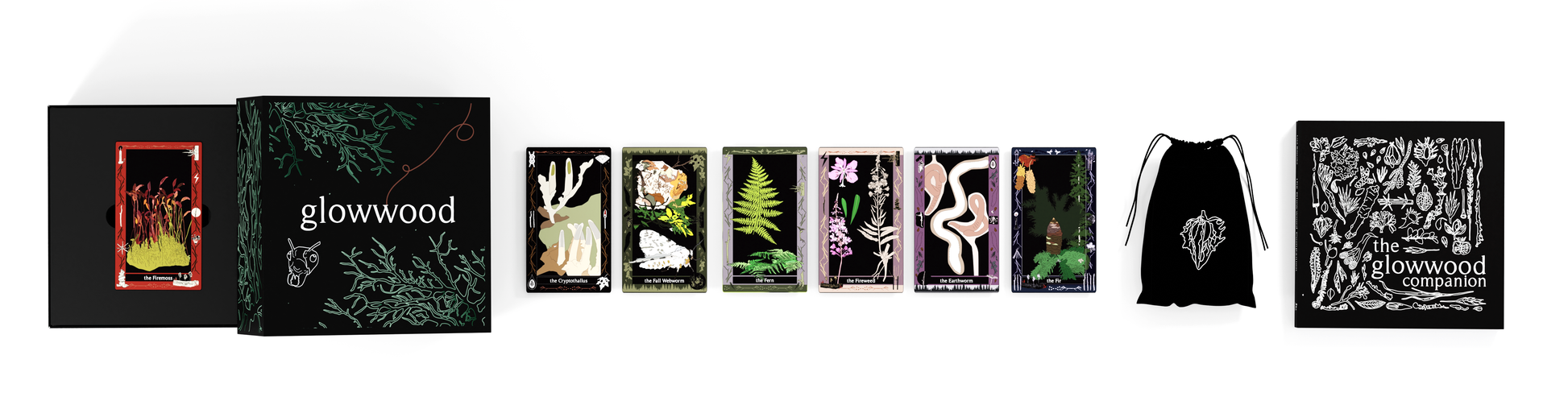 Wander into Glowwood — an oracle card deck rooted in ecology, written in nature’s language — and allow its plants, insects, fungi, lichens, and minerals to enmesh you in their wild and knotted relationships. Their landscapes are reflections of ourselves.